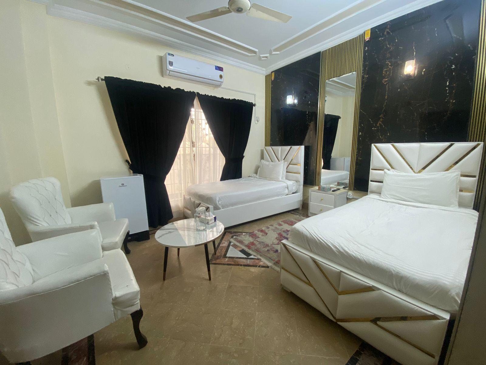 One knal guest house for rent available f6 4 main nazumudin road 13 rooms furnished 3. Story basement ground plus one .4 cars parking .lobby .rent 10 lac